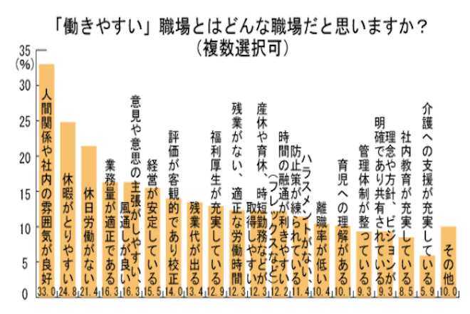 育児や介護のあるなしに関わらず、多くの人にとっての「働きやすい職場」とは、まず法令を遵守し、人間関係が良好であるなど、働く人が心身ともに健康に安心して働ける環境であることが大前提です。