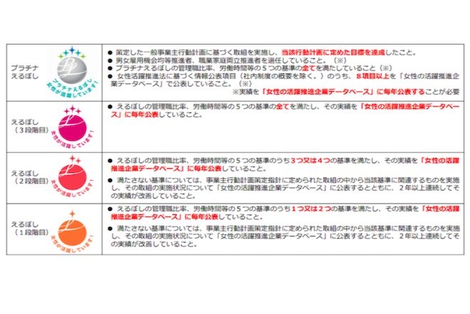 参考:『女性活躍推進法特集ページ(えるぼし認定・プラチナえるぼし認定)』厚生労働省