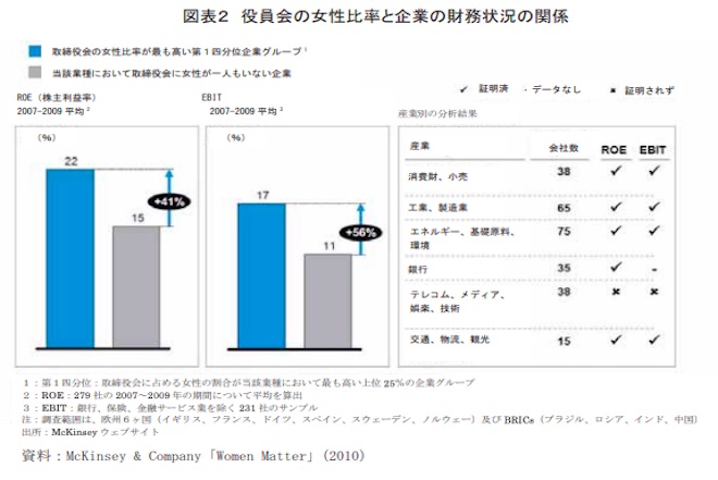 世界では、女性役員比率が高い企業の方が、株主資本利益率、売上高利益率、投資資本利益率などの経営指標が高い傾向がみられます。