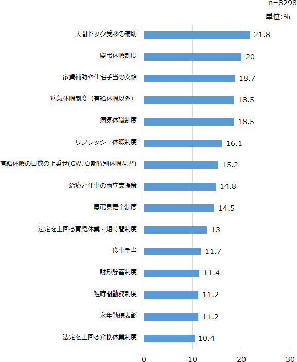 従業員が自分にとって必要だと思う福利厚生を調べたアンケートの結果でも、人間ドック受診の補助をはじめ、治療と仕事の両立支援など、「健康管理」に関する福利厚生を重要視していることが分かりました。また、法定を上回る育児休業・短時間制度や介護休業制度など、ライフステージの変化に対応するための福利厚生も求められています。