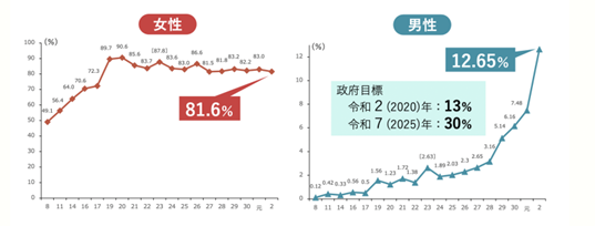 厚生労働省は、令和4年4月1日より育児・介護休業法の改正を3段階で施行し、10月1日には、産後パパ育休(出生児育児休業)が創設され、育児休業の分割取得が可能となりました。この施行の背景には、女性の育児休業率が8割を上回る一方で、男性は1割強にしか満たないという現状があります。また、育休期間においても、女性の取得期間が半年以上なのに対して、男性の取得期間はわずか5日程度となっています。一概に数字だけで判断できるものではありませんが、取得率だけでなく取得期間においても男女で大きな差があります。