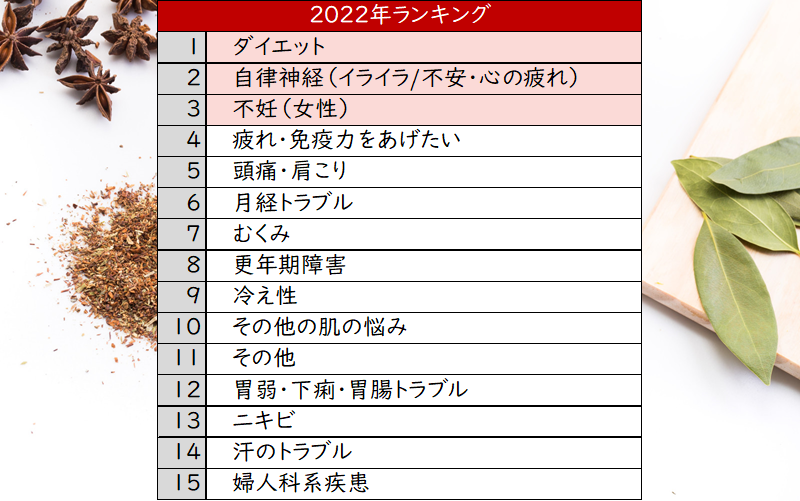わたし漢方に昨年寄せられたお悩みの中で、最も多かったのは「ダイエット」。続く2位が「自律神経(イライラ / 不安・心の疲れ)」、3位が「不妊(女性)」でした。