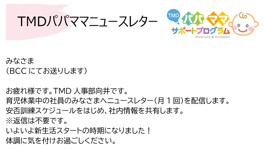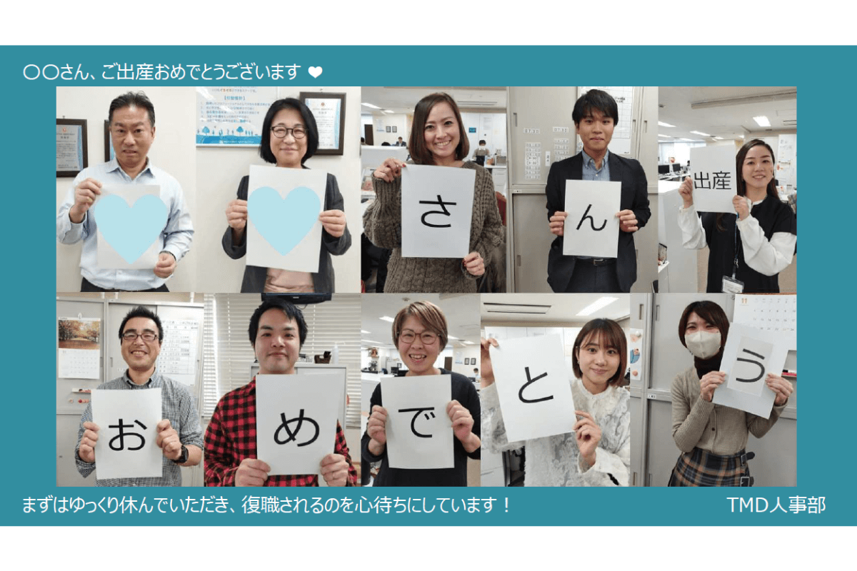 向井 ちょうど昨日出産の報告を受けて、役員の方と人事部の写真を使って「おめでとう」のメッセージを送ったところです。産・育休中も会社との接点を持てるよう、人事部としてコミュニケーションをとるようにしています。