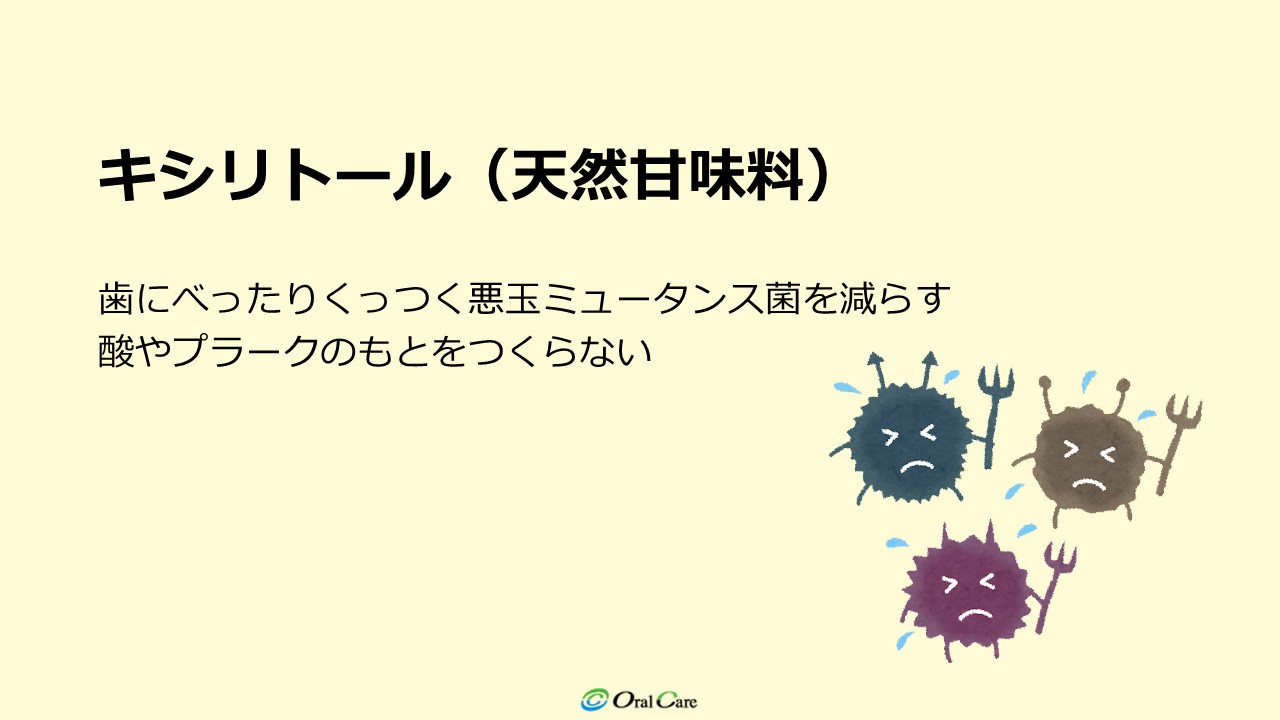 キシリトールを選ぶ際は、キシリトールの入っている量が多いもの、50%以上配合のものを選んでいただくのがおすすめです。そうでないとミュータンス菌を弱らせるなどの働きが起こりにくいです。