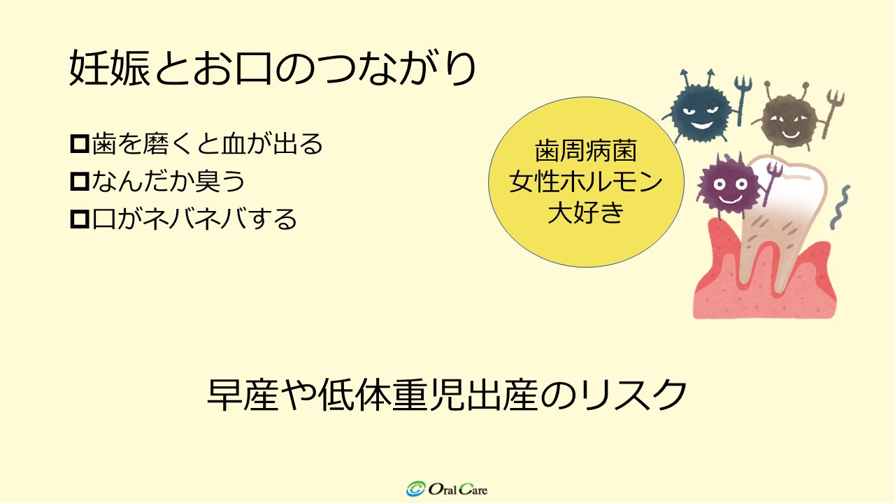 口の中の歯周病細菌が血中に入り、胎盤を通して胎児に直接感染するのではないかともいわれていて、お口の中の細菌が多かったり、歯周病があると、いろいろな病気のリスクをあげることにもつながります。