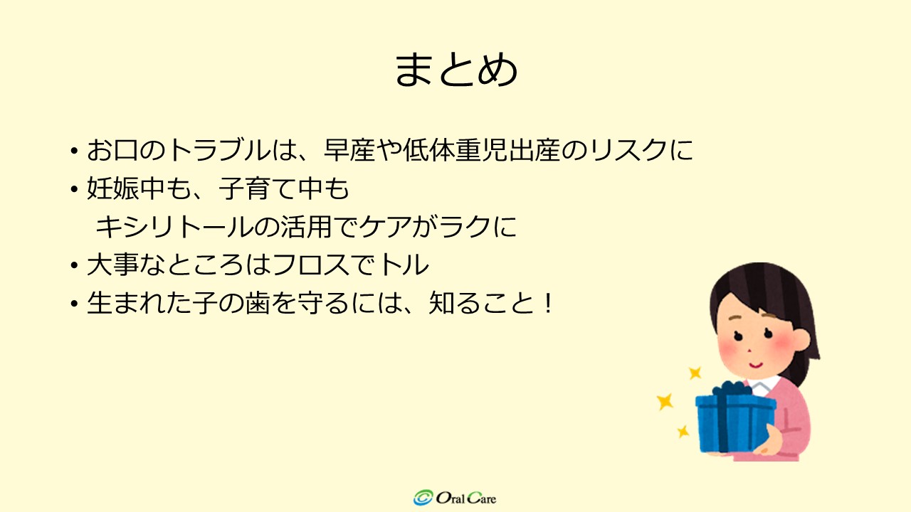 これからママになるみなさんには、ぜひ甘味料のキシリトールを活用してほしいと思います。妊娠すると唾液がでない人も多いのでガムを使うのもオススメです。