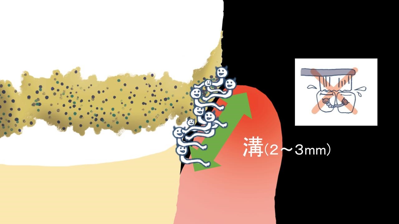 健康な歯ぐきでも2~3ミリの溝があり、ここにとどまって悪さするのが歯周病菌。