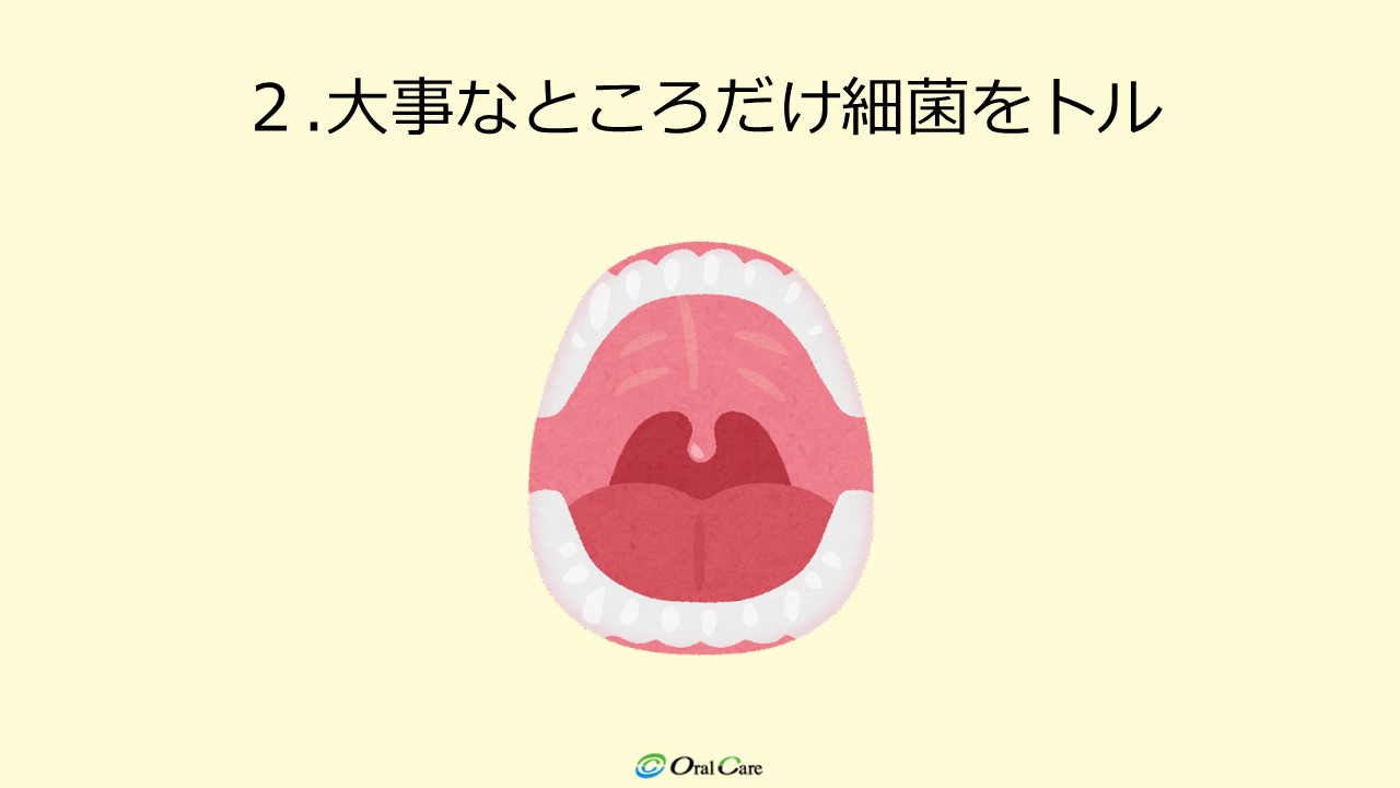最初に歯にくっつく細菌たちを弱らせておくことがポイントです。そうすると細菌の塊ができにくくなります。