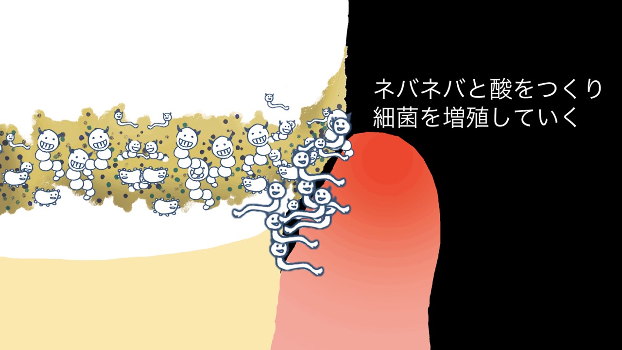 一番やっかいなのは、このネバネバ。ネバネバを足掛かりに、細菌をどんどんよせつけて増やしていきます。2日以上放置しておくと、歯周病菌が増えてきます。