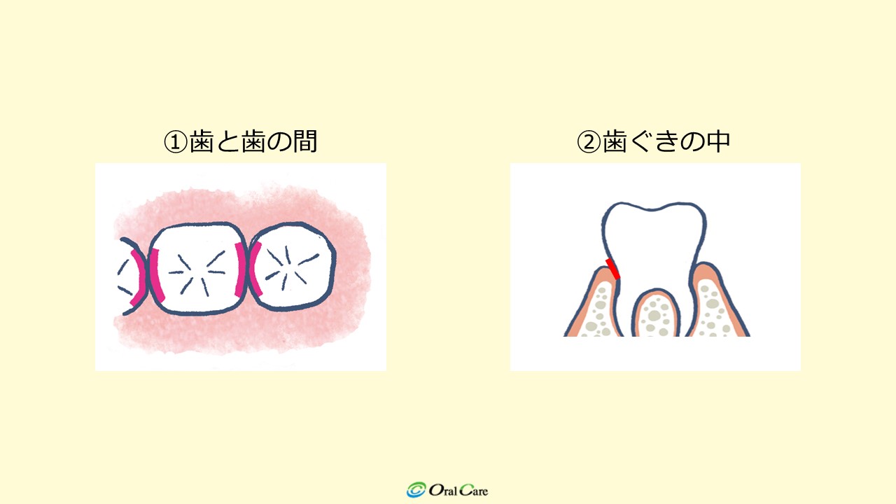 ぜひフロスはお子さんから使ってください。歯と歯がくっついている場所に使っていただくと良いです。特に奥歯や前歯は歯と歯の間がくっついているので、この辺りを重点的にフロスをはじめてください。