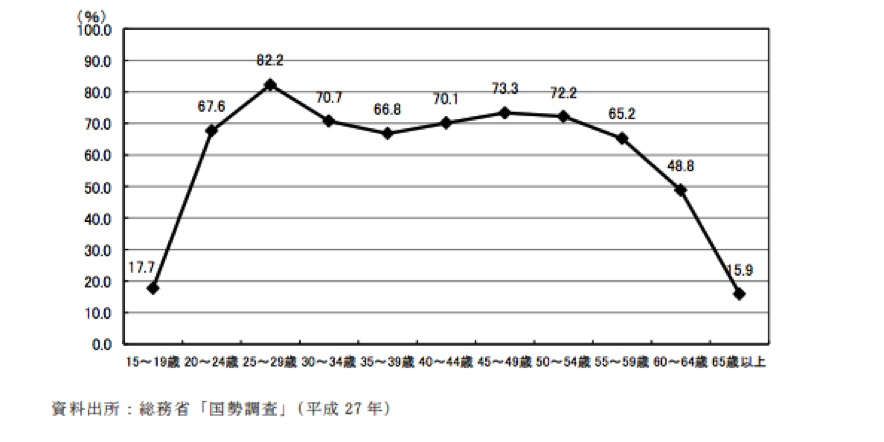 このグラフの中で25〜29歳の「82.2%」と最も働いている人の割合が大きくなっている年齢から次第に下がり、35〜39歳では「66.8%」と働き盛りの年代では最低となります。そしてそこから徐々に増加していきます。