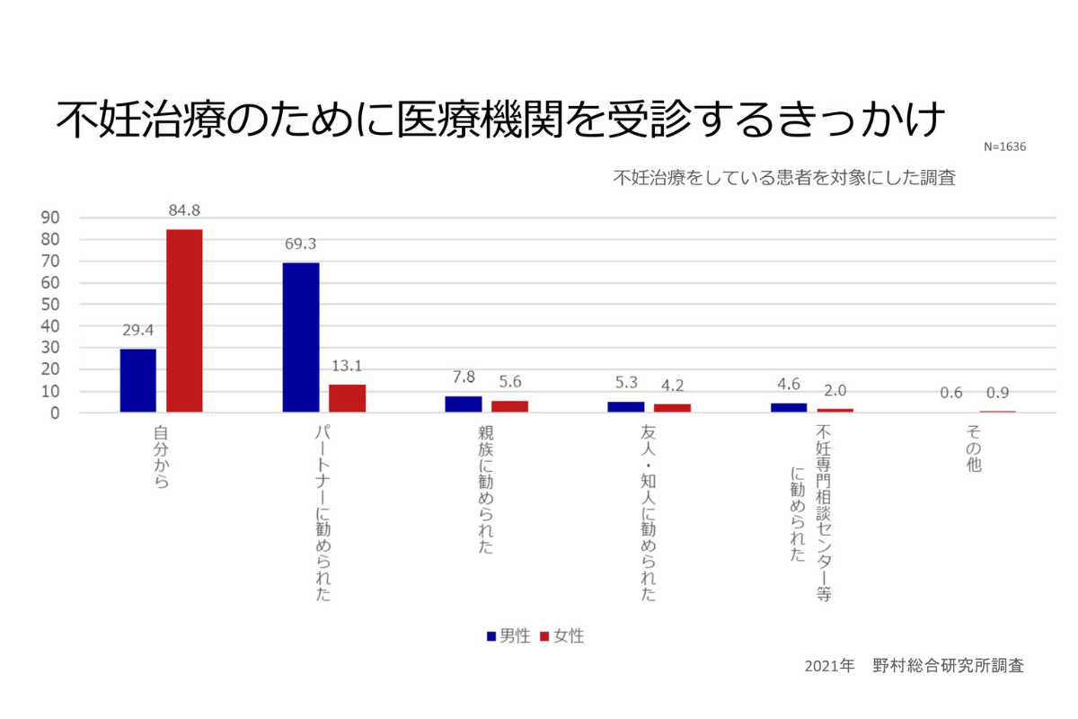 野村総合研究所は不妊治療に取り組んでいる患者を対象に、「不妊治療のために医療機関を受診するきっかけ」を調査しました。この調査によると男性が自ら受診する割合よりも、パートナーから勧められて受診する割合の方が大きくなっています。