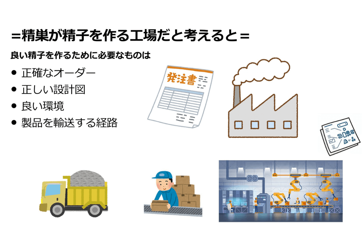 精巣が精子を作る工場だと考えると、精子を作るために必要なオーダー(下垂体ホルモン)、工場の状態(精巣内の構造や精索静脈瘤の有無)、製品の設計図(染色体や遺伝子)、製品を輸送する経路(精巣上体や精管)の4点に問題がないかを、しっかりとチェックする必要があります。