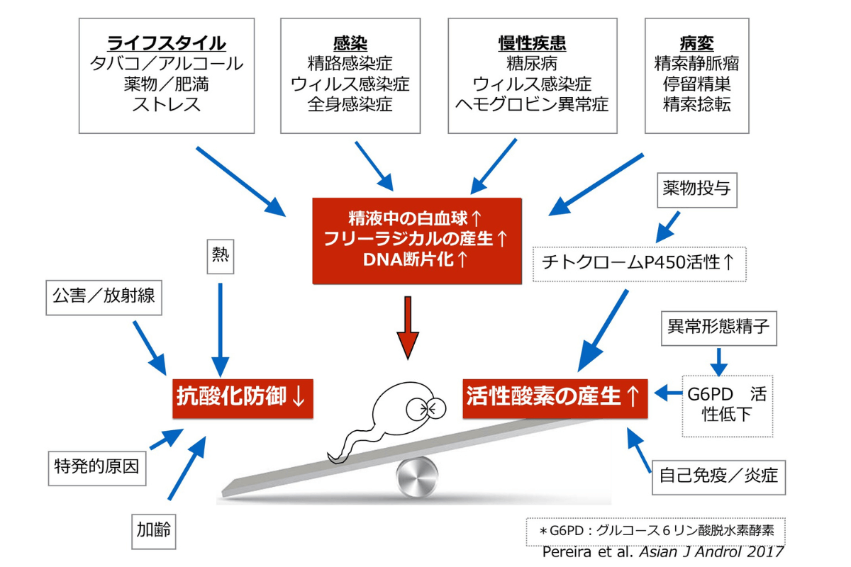 精巣環境を悪化させる因子の一つに、「酸化ストレス」があります。喫煙、飲酒、サウナなどの生活習慣や糖尿病は酸化ストレスを増やし、精子の状態を悪くすることが明らかになっています。