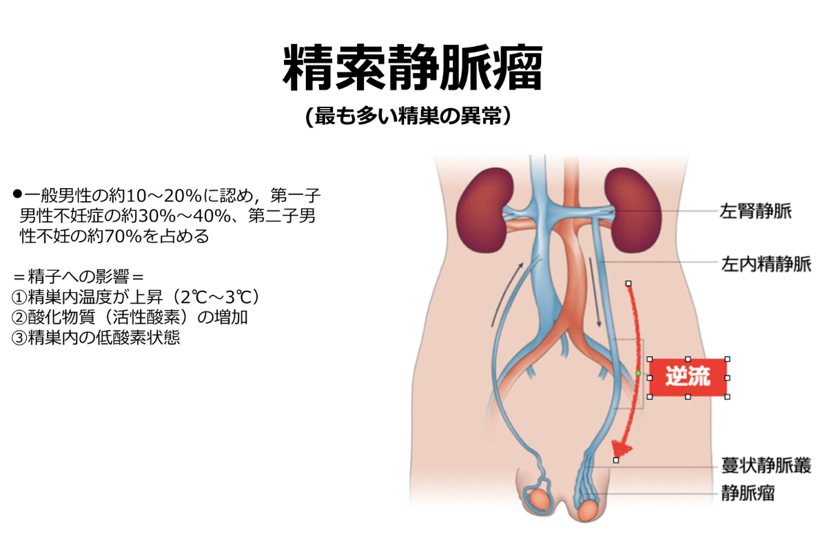 また酸化ストレスを増加させる器質的な異常の一つに「精索静脈瘤」があります。これは精巣からの静脈血が逆流することによって起こります。精索静脈瘤は、一般男性の約1〜2割が該当する症状で特に命には関わりませんが、精巣状態の悪化原因になります。実際、不妊に悩む男性の精索静脈瘤保有率は高くなっています。