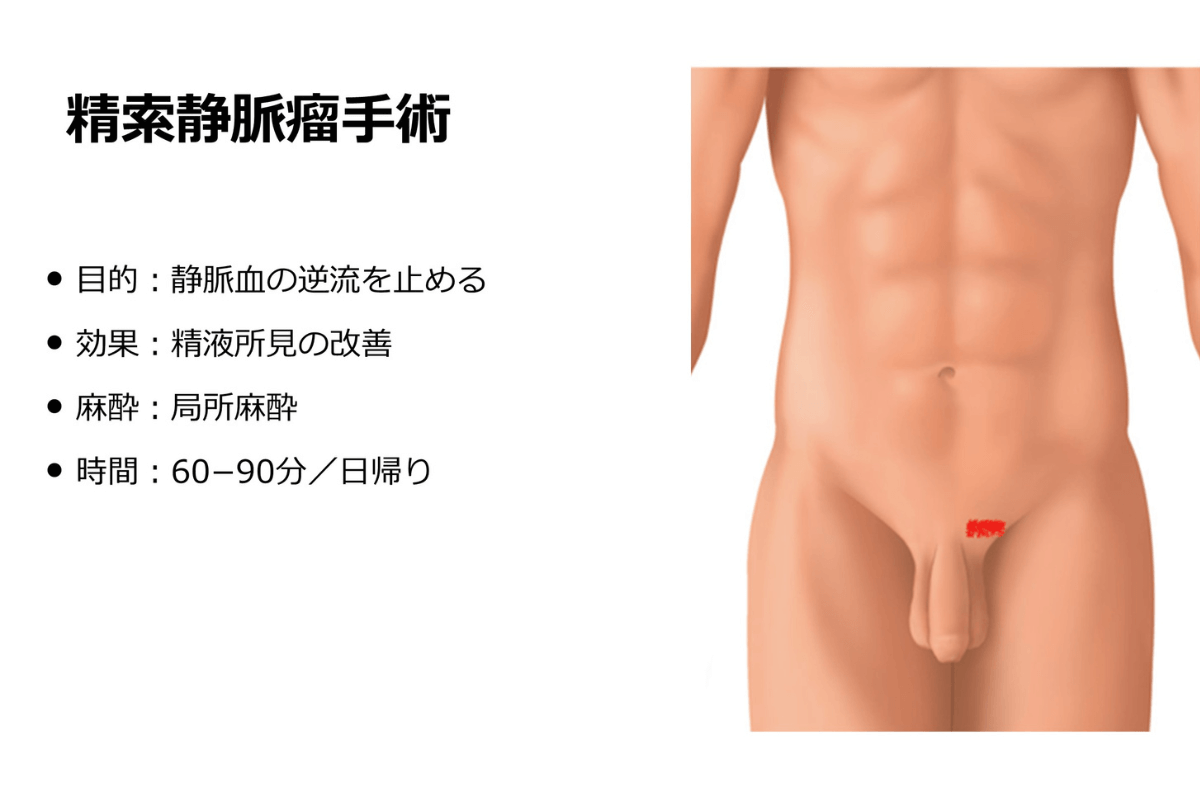 精索静脈瘤は、逆流を止める手術で改善できます。ただ精子が造られて外に出てくるまで3カ月ほどかかるため、精子の状態が良好となるのは手術をしてから約3ヶ月後です。