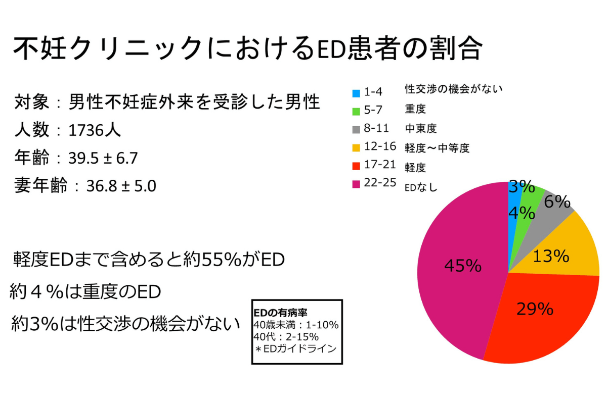男性不妊症外来を受診した男性を対象にしたED症状の調査をしたところ、半数を超える約55%の男性が機能不全障害でした。一般の有病率と比較すると、かなりの割合であることがわかります。