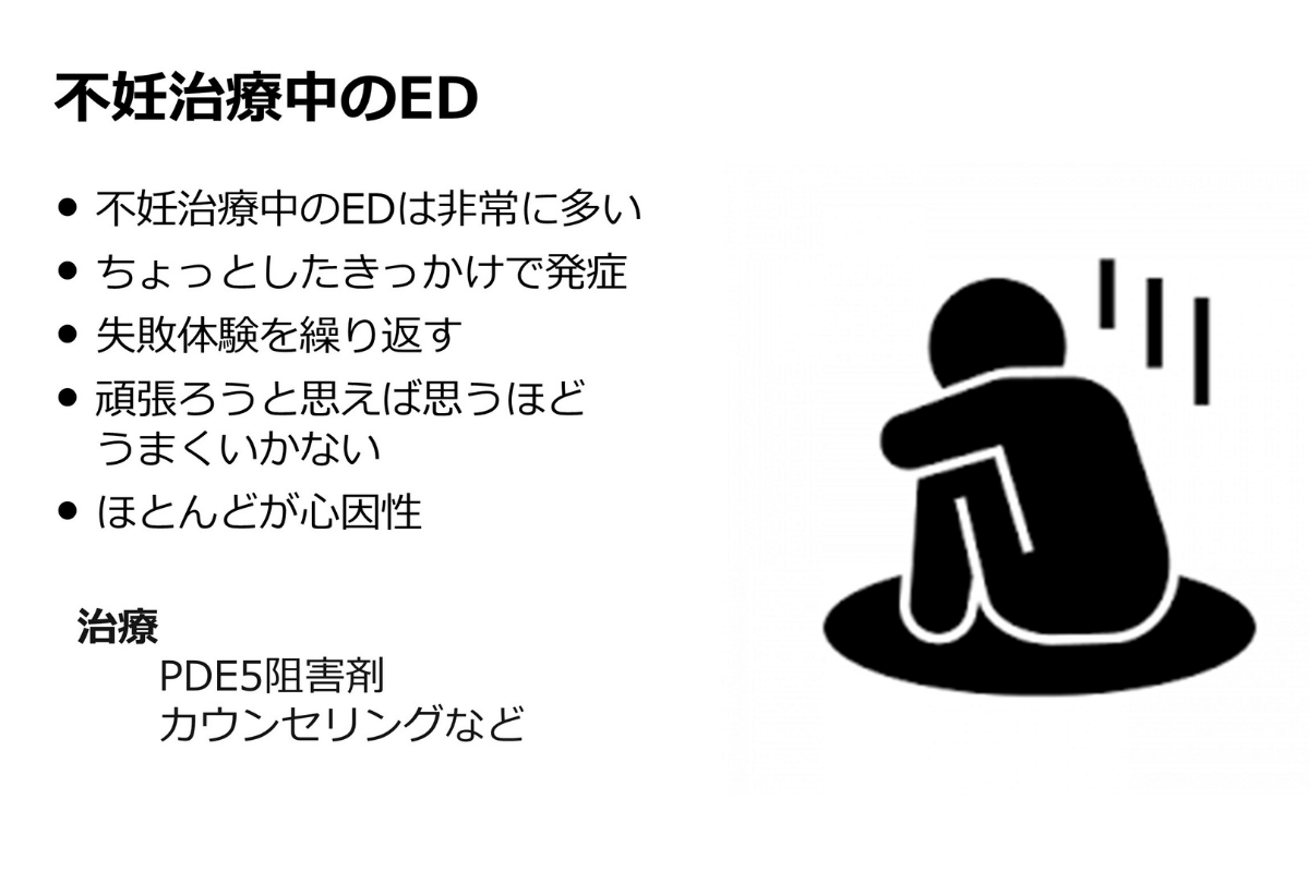 機能不全障害は、本当にちょっとしたきっかけで起こります。不妊治療中の男性は、「排卵日に合わせて性交渉しなければならない」と義務感を持つようになります。しかし、そもそも勃起も射精も性的な興奮があるから起こる現象です。仕事のような義務感では、性交渉はうまくいきません。性交渉がうまくできなかった経験を繰り返すと自信をなくし、「頑張ろう」と思えば思うほどうまくいかない。これが典型的な発症パターンになります。
