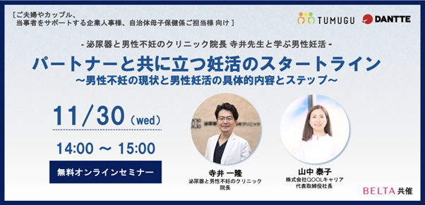 本セミナーは、 男性の妊活をサポートする検査やサプリを提供する株式会社ダンテおよび葉酸や妊活サプリなどの美容健康食品を取り扱う株式会社ベルタとの共催で、 ゲストに泌尿器と男性不妊のクリニック 寺井院長をお招きし、 妊活中やこれから妊活を考えている方々、 当事者をサポートする企業の人事労務 担当者が知っておくべき 男性不妊の現状や男性妊活の具体的な内容、 企業人事が取り組むべき福利厚生の在り方についてお話をいたします。